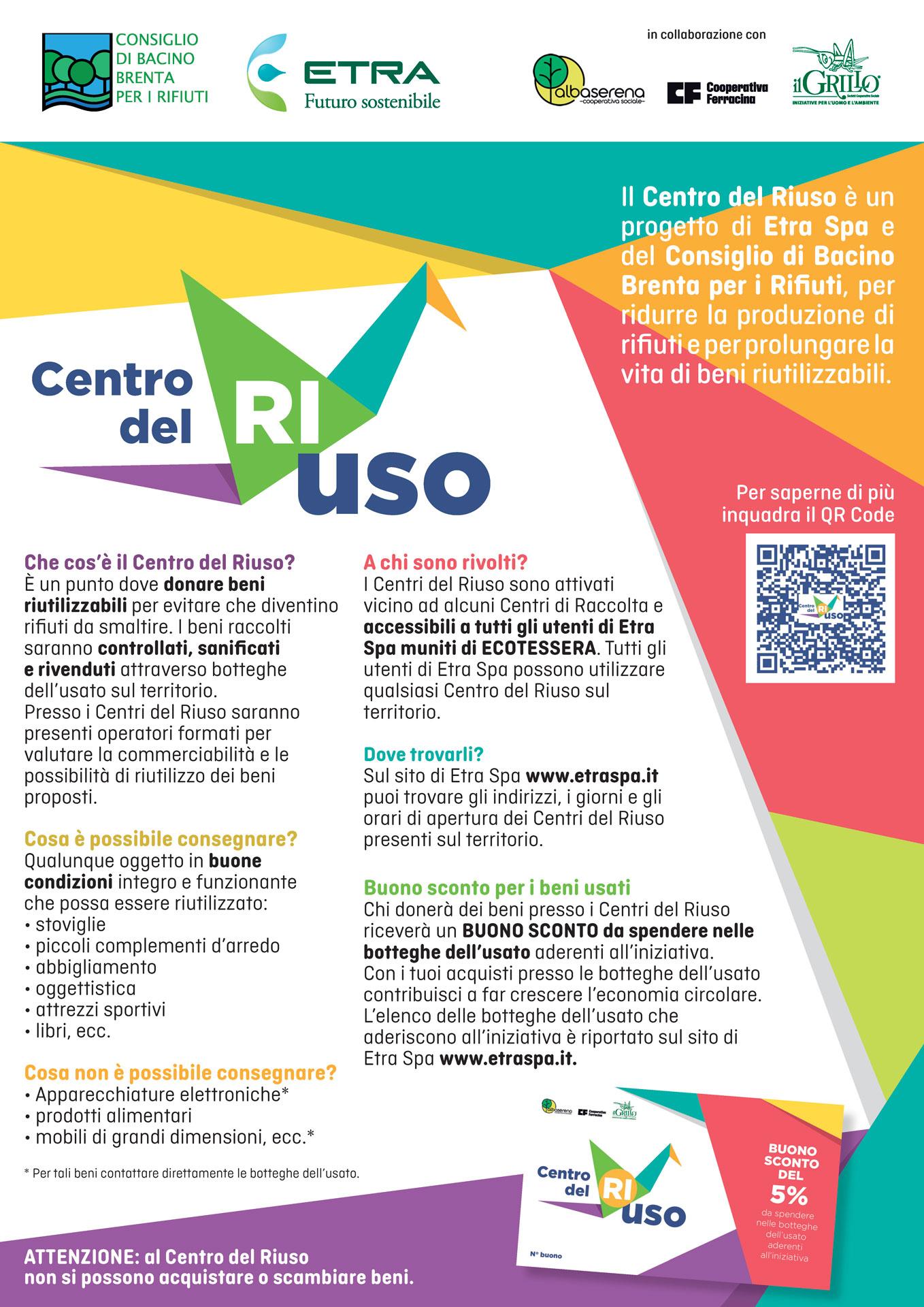 Il Centro del Riuso è un progetto di Etra Spa e del Consiglio di Bacino Brenta per i Rifiuti, per ridurre la produzione di rifiuti e per prolungare la vita di beni riutilizzabili. Si tratta di aree dedicate alla raccolta di oggetti, manufatti e quanto possa essere ancora funzionante e riutilizzato. Gli operatori presenti rilasceranno un documento di ricevuta e un buono sconto a fronte della donazione volontaria dell’oggetto. Tutto ciò che verrà raccolto potrà avere una nuova vita, rimesso in uso e in commercio in appositi punti vendita autorizzati gestiti da soggetti del terzo settore e/o valorizzati per sostenere attività e progetti a valenza sociale.