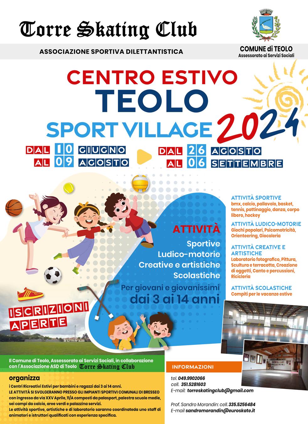 Il Comune di Teolo, Assessorato ai Servizi Sociali, in collaborazione con l’Associazione ASD di Teolo Torre Skating Club , organizza i Centri Ricreativi Estivi per bambini e ragazzi dai 3 ai 14 anni, dal 10 Giugno al 09 Agosto e dal 26 Agosto al 06 Settembre.
