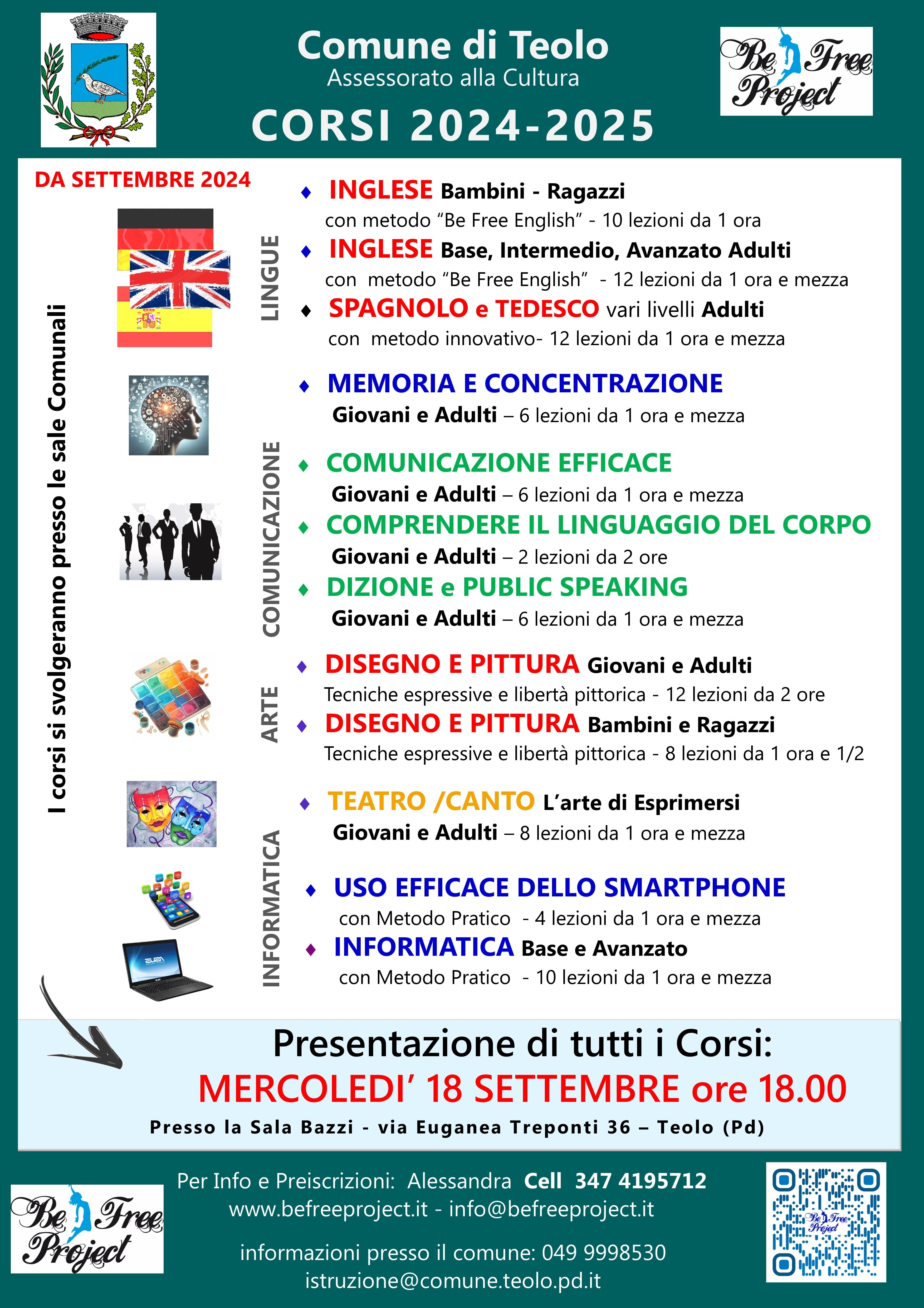 Per l'anno 2024/25 vengono proposti i seguenti corsi organizzati da Be Free Project: