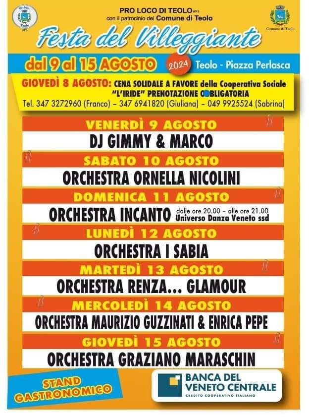 Festa del Villeggiante ad opera della Proloco di Teolo, da venerdì 9 a giovedì 15 agosto, tutte le sere dalle 19:00 stand gastronomico in piazza Perlasca a Teolo, serate di musica in piazza: