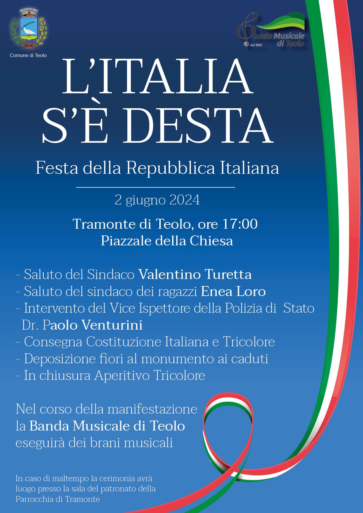 Si invitano le SS.LL. a partecipare alla celebrazione organizzata dall'Amministrazione Comunale in occasione della Festa della Repubblica, domenica 2 giugno p.v., che avrà luogo presso il piazzale della Chiesa a Tramonte di Teolo con il seguente programma: