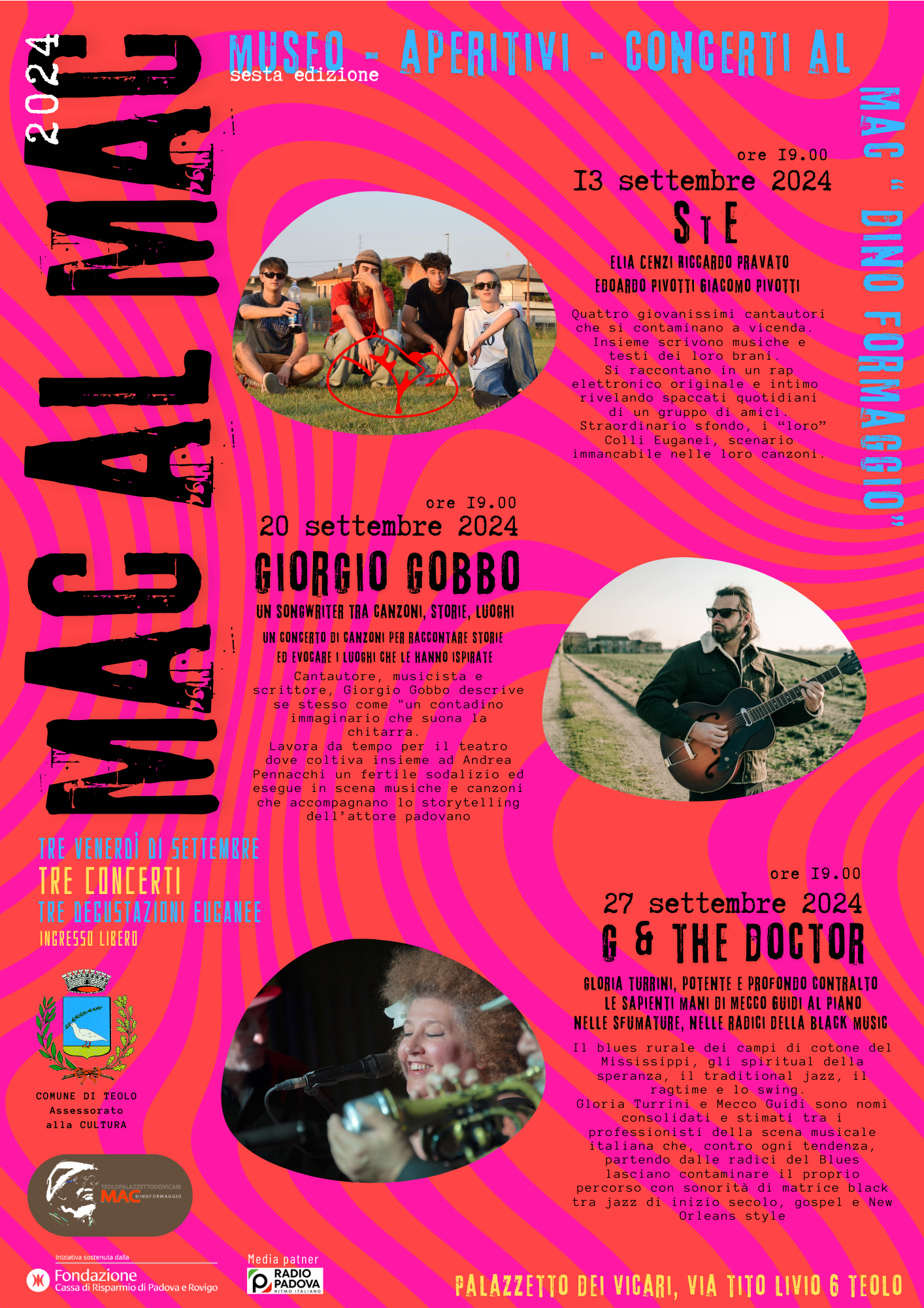 MAC AL MAC è una rassegna di tre concerti, ad ingresso libero, proposta nel pre serata del venerdì, della durata di circa due ore con inizio dalle 19.00, al Museo di Arte Contemporanea “Dino Formaggio”. Ogni concerto è accompagnato da degustazioni enogastronomiche offerte da esercenti del territorio del Comune di Teolo. Un’immersione nella musica e nell’arte contemporanea del nostro Museo, quest’ultima rinnovata dalla mostra personale “SILLABARI” del prestigioso artista POPE GALLI, mostra che inaugurerà il 21 settembre 2024 e che sarà visitabile fino a metà novembre 2024. I tre concerti in programma nella sesta edizione 2024 di MAC al MAC raccontano l’intima anima musicale dei gruppi artistici coinvolti, delineato le personali e diverse esperienze artistiche dei tre generi musicali. Arte, musica e degustazioni nel cuore del nostro splendido territorio euganeo, per diffondere al pubblico la preziosa offerta culturale del Comune di Teolo, espressa dal nostro MAC DINO FORMAGGIO.