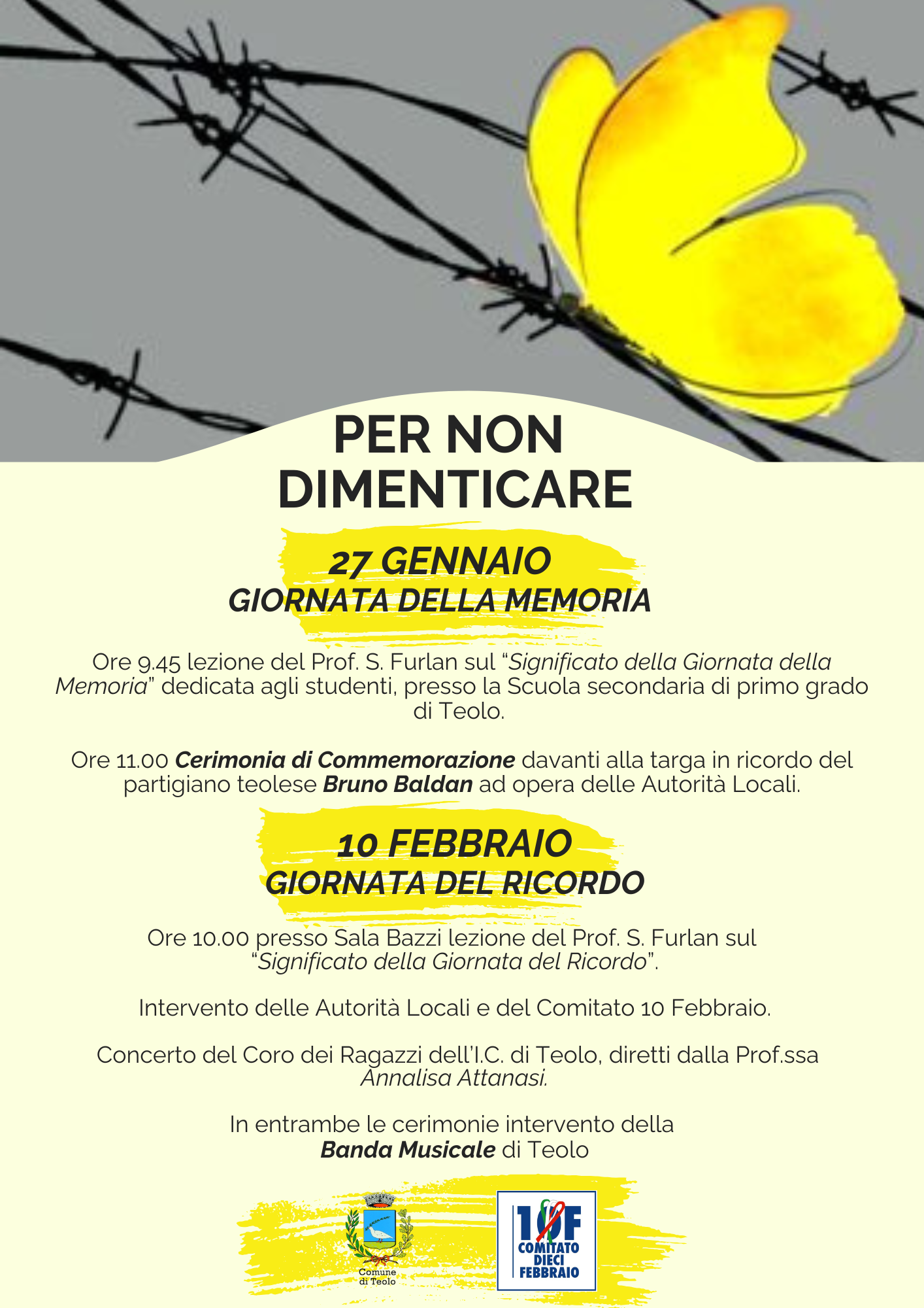 -Ore 10.00 presso Sala Bazzi lezione del Prof. S. Furlan sul “Significato della Giornata del Ricordo”. Intervento delle Autorità Locali e del Comitato 10 Febbraio. Concerto del Coro dei Ragazzi dell’I.C. di Teolo, diretti dalla Prof.ssa Annalisa Attanasi. In entrambe le cerimonie intervento della Banda Musicale di Teolo.