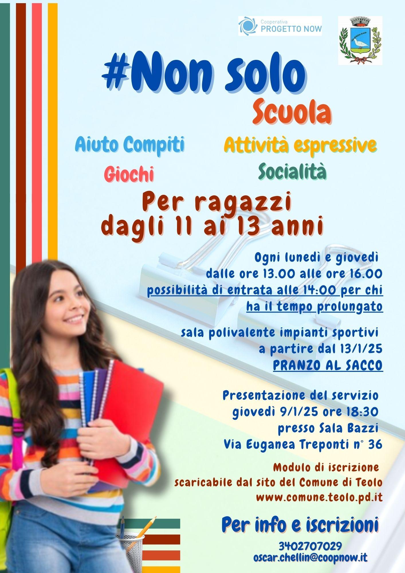 Non solo scuola è un progetto dedicato ai ragazzi dagli 11 ai 13 anni, che prevede attività espressive, momenti di socialità, aiuto compiti e giochi.