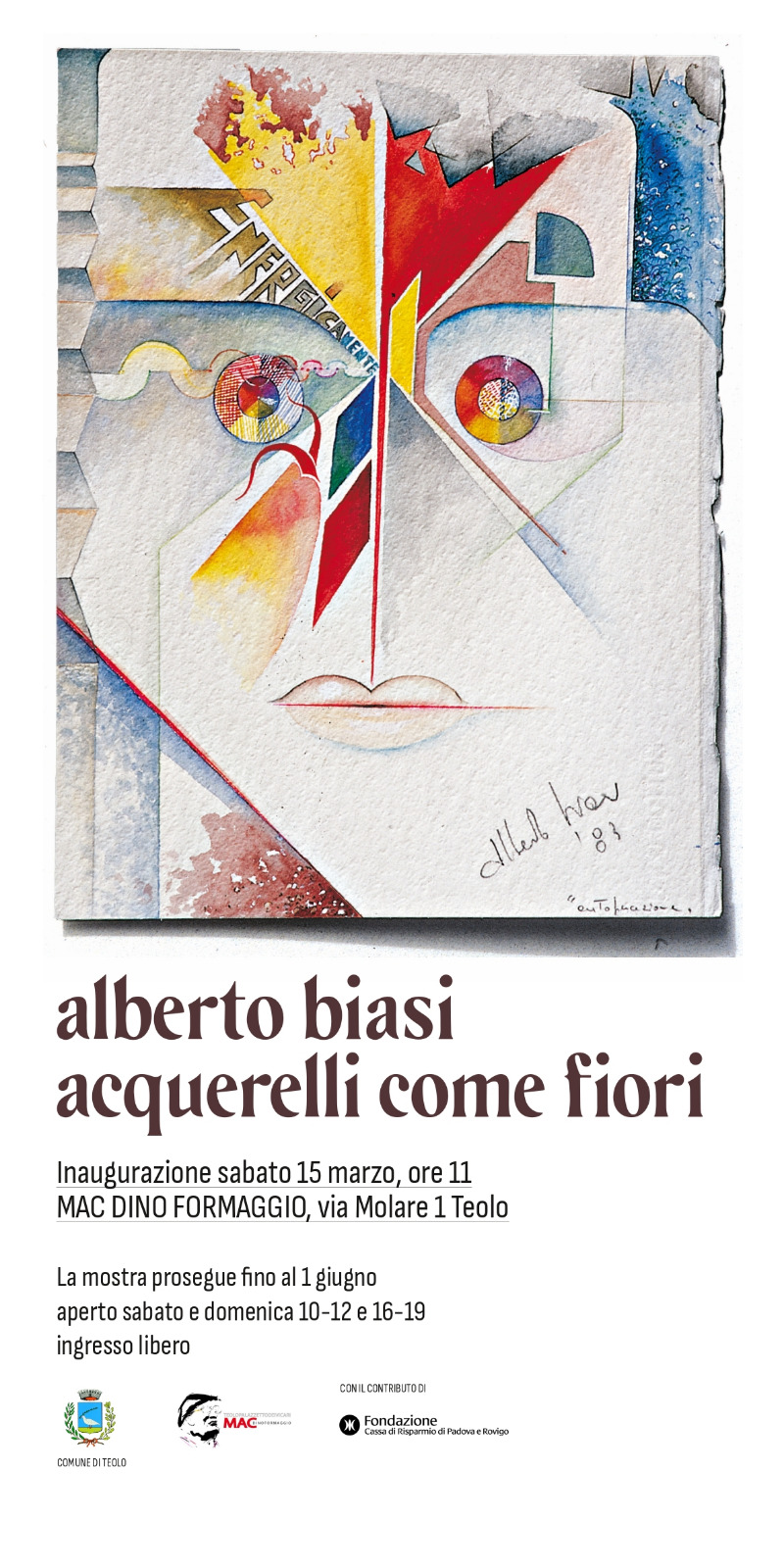Alberto Biasi sarà al Museo di Arte Contemporanea Dino Formaggio di Teolo con una sua mostra personale. Apre infatti sabato 15 marzo alle ore 11, alla presenza dell'artista, "Acquerelli come fiori".