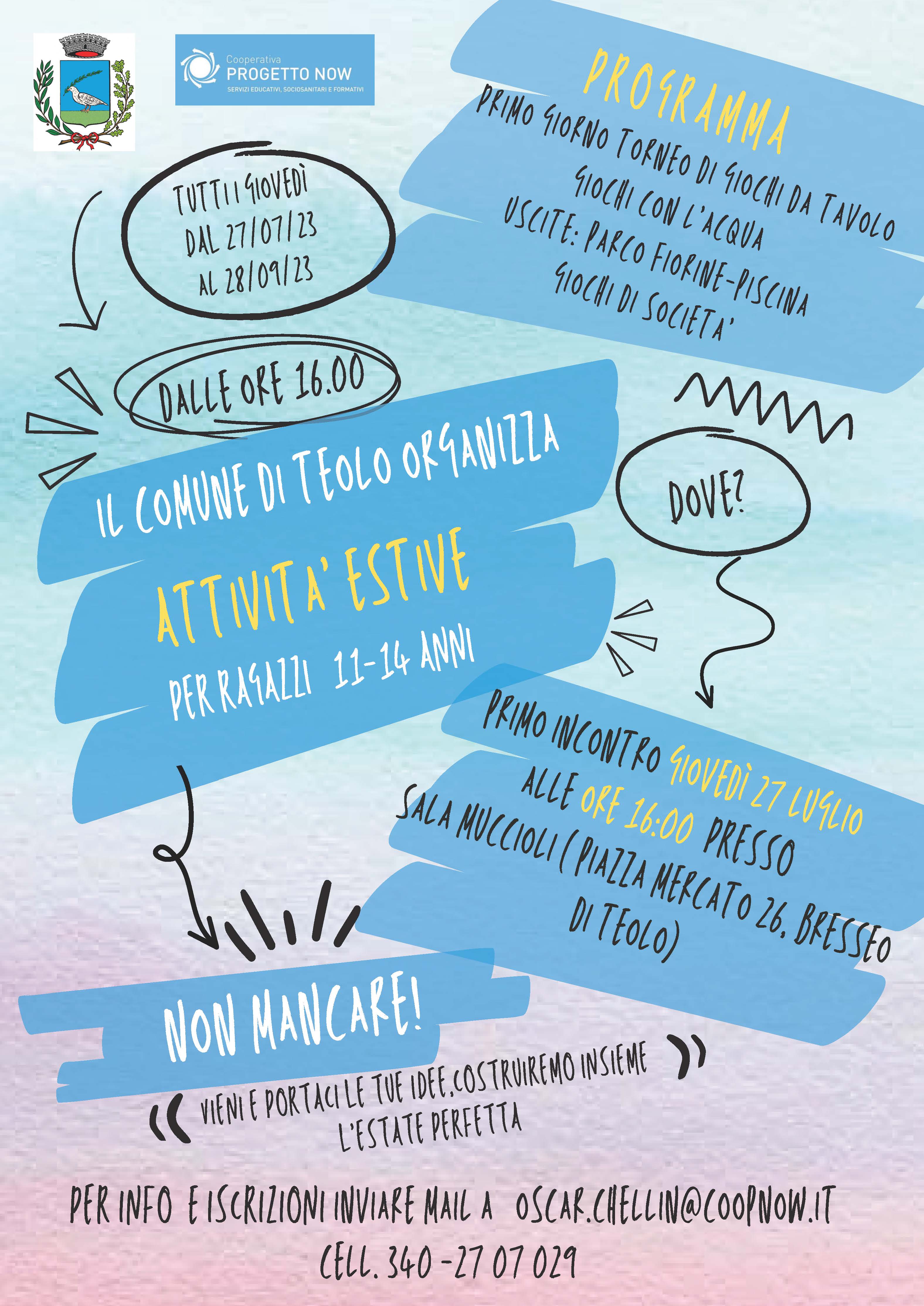 Tutti i giovedì dal 27 luglio al 28 settembre 2023, dalle ore 16.00, il Comune di Teolo organizza le Attività Estive per i ragazzi dagli 11 ai 14 anni.