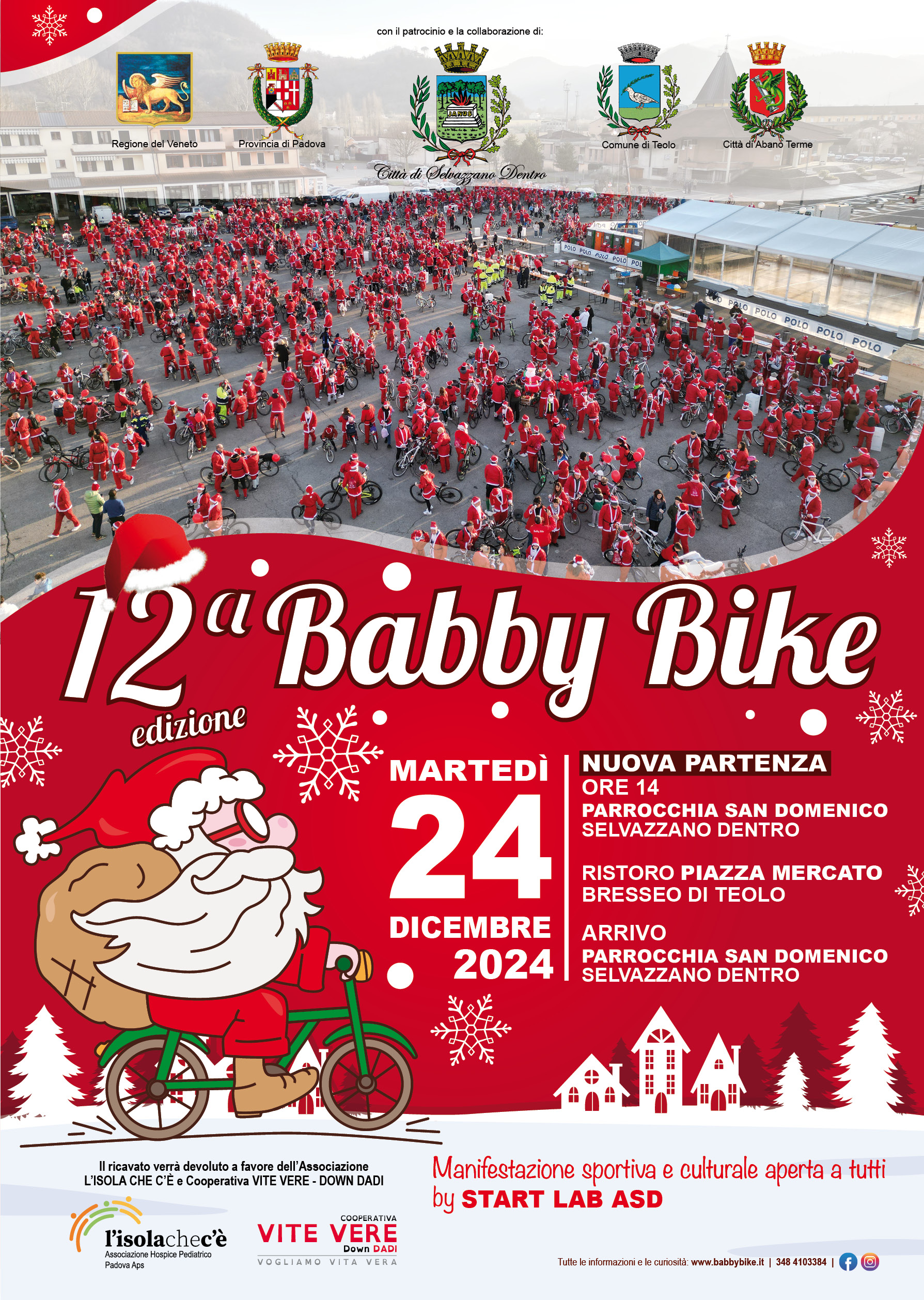 12ª edizione Babby Bike Martedì 24 dicembre 2024 si terrà la tradizionale pedalata di solidarietà in costume natalizio, aperta a tutti.