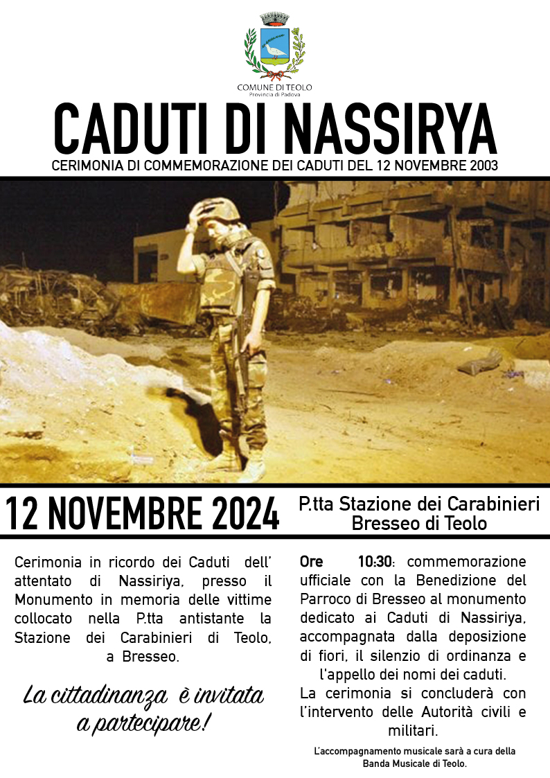 Ore 10:30: commemorazione ufficiale con la Benedizione del Parroco di Bresseo al monumento dedicato ai Caduti di Nassiriya, accompagnata dalla deposizione di fiori, il silenzio di ordinanza e l'appello dei nomi dei caduti.