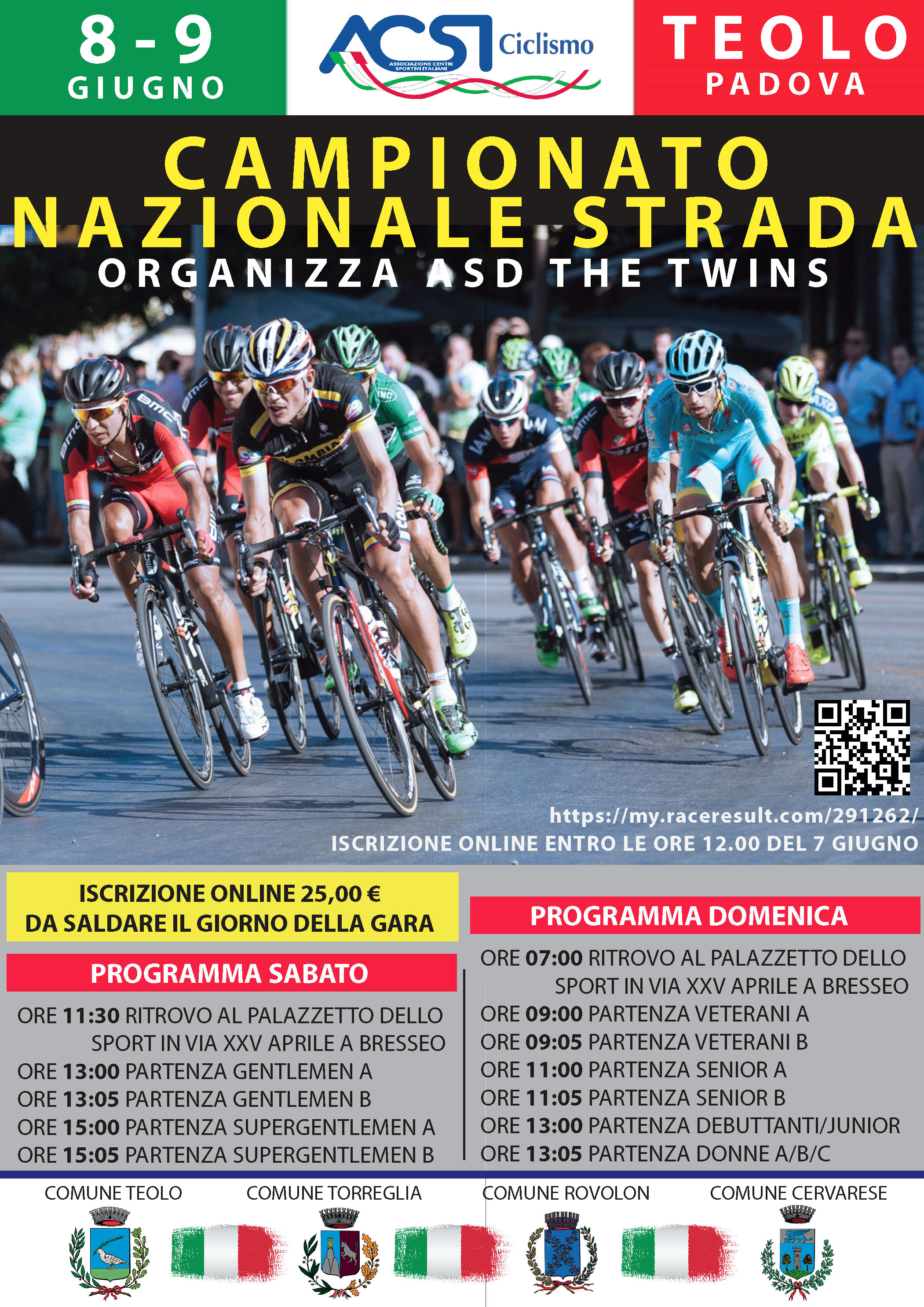 il provvedimento n. prot. 38087/24, emesso in data 27/5/2024, con il quale la Provincia di Padova ha autorizzato lo svolgimento della gara ciclistica denominata "CAMPIONATO NAZIONALE ACSI STRADA 2024", organizzata dalla A.S.D. THE TWINS per il giorno 8/6/2024, con partenza alle ore 13:00 da Via Euganea nel Comune di Teolo (Palazzetto dello sport di Bresseo) e per il giorno 9/6/2024, con partenza alle ore 9:00 da Via Euganea nel Comune di Teolo (Palazzetto dello sport di Bresseo);