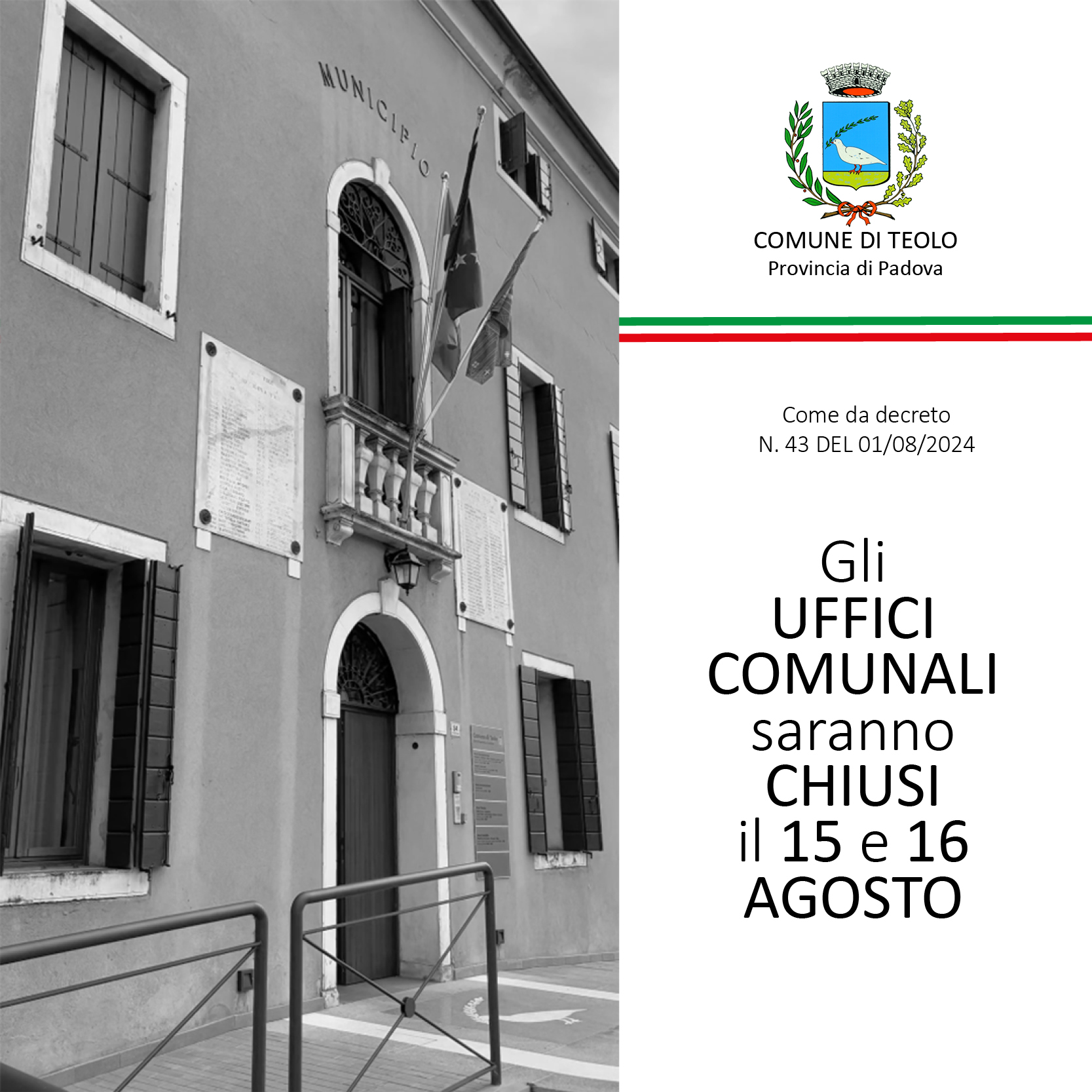 Si informa la cittadinanza che gli uffici comunali saranno chiusi al pubblico nella giornate di giovedi 15 e venerdì 16 agosto 2024.