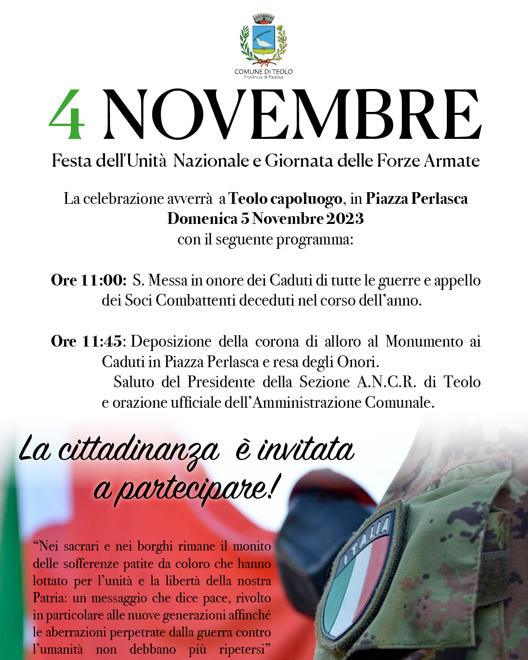 La celebrazione avverrà a Teolo capoluogo, in Piazza Perlasca Domenica 5 Novembre 2023