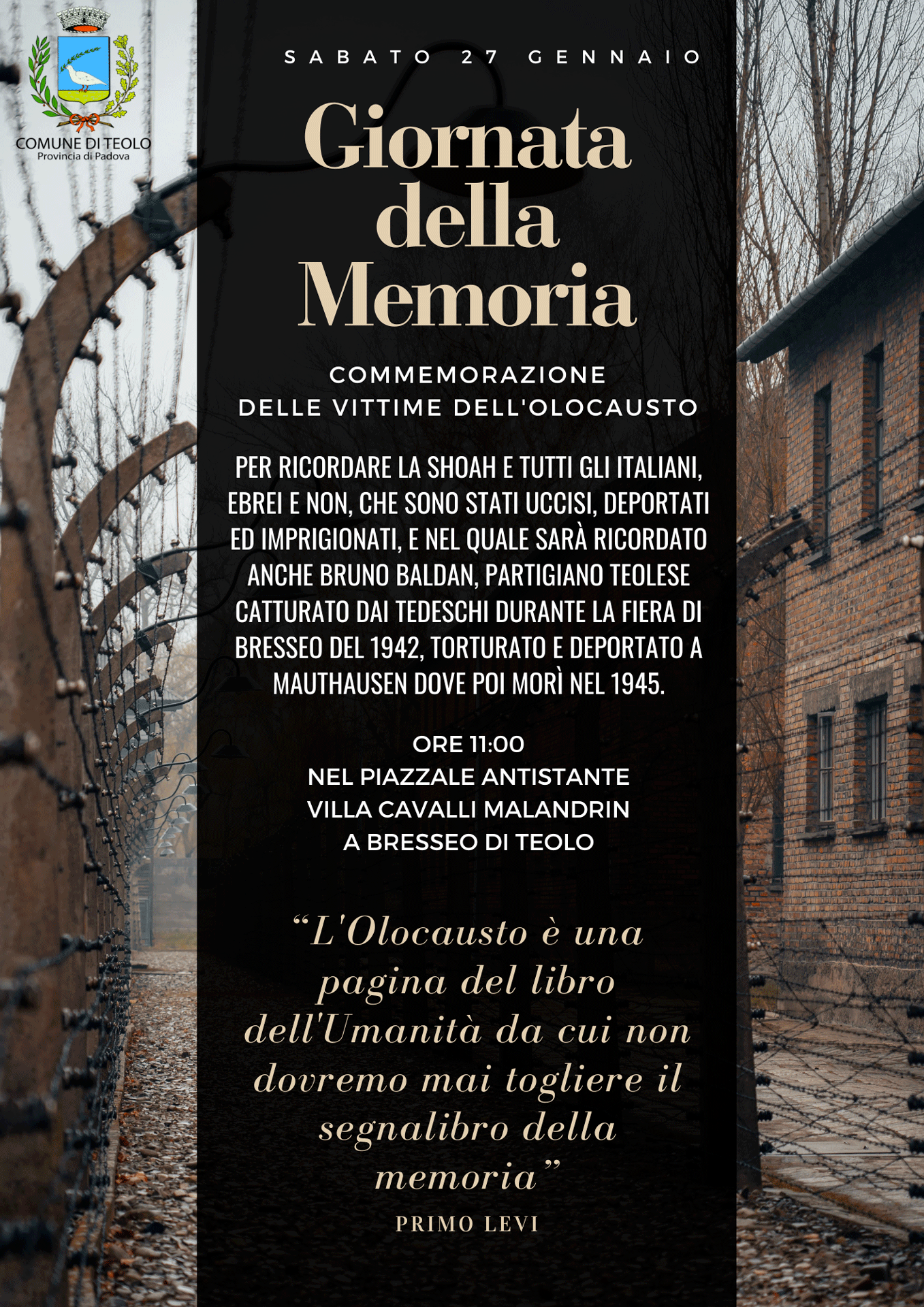 Commemorazione delle vittime dell'olocausto per ricordare la shoah e tutti gli italiani, ebrei e non, che sono stati uccisi, deportati ed imprigionati, e nel quale sarà ricordato anche Bruno Baldan, partigiano teolese catturato dai tedeschi durante la Fiera di Bresseo del 1942, torturato e deportato a Mauthausen dove poi morÌ nel 1945.