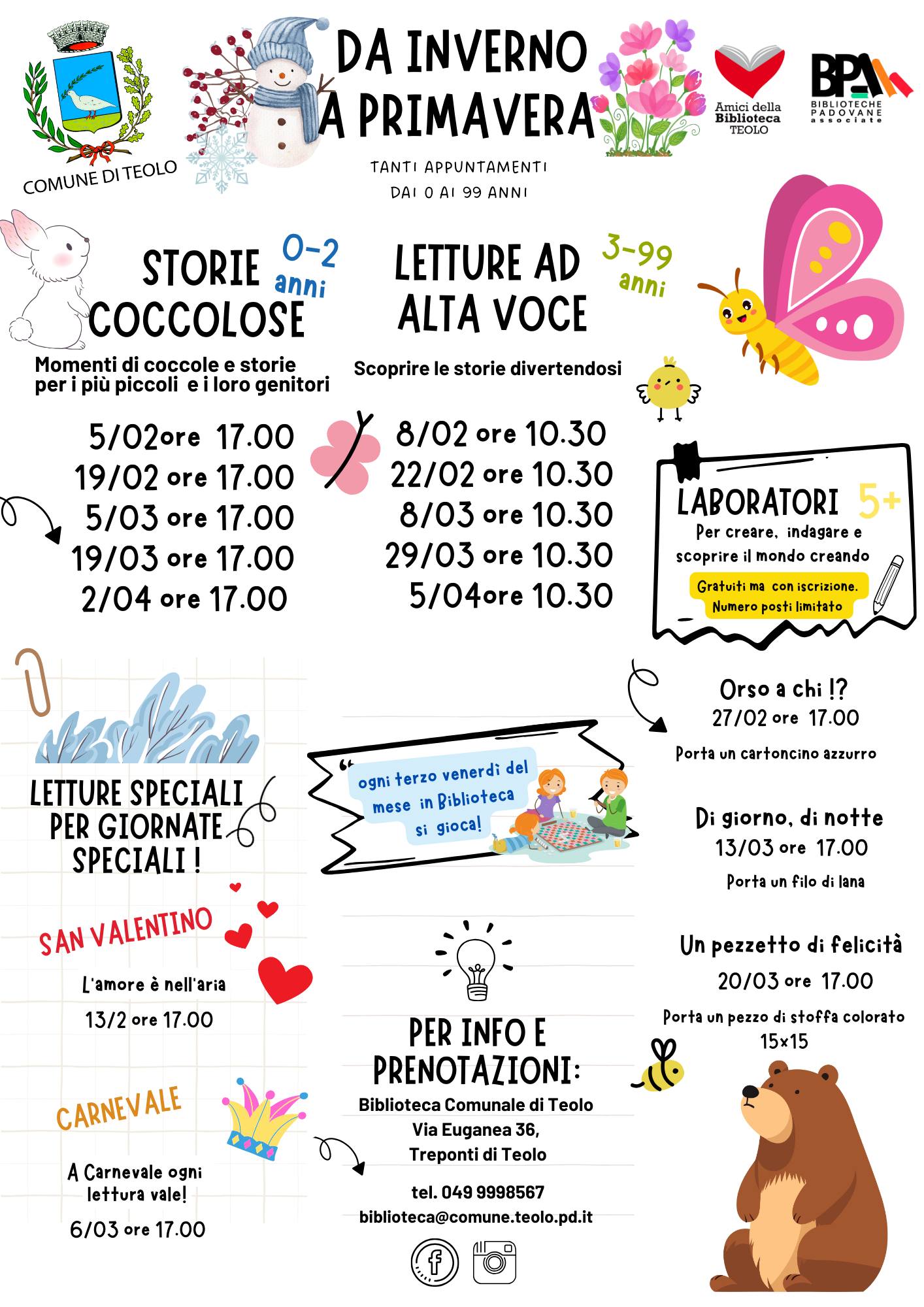 Da Inverno a Primavera: eventi per tutte le età in Biblioteca La Biblioteca Comunale di Teolo organizza una serie di appuntamenti dedicati a bambini, famiglie e appassionati di lettura.