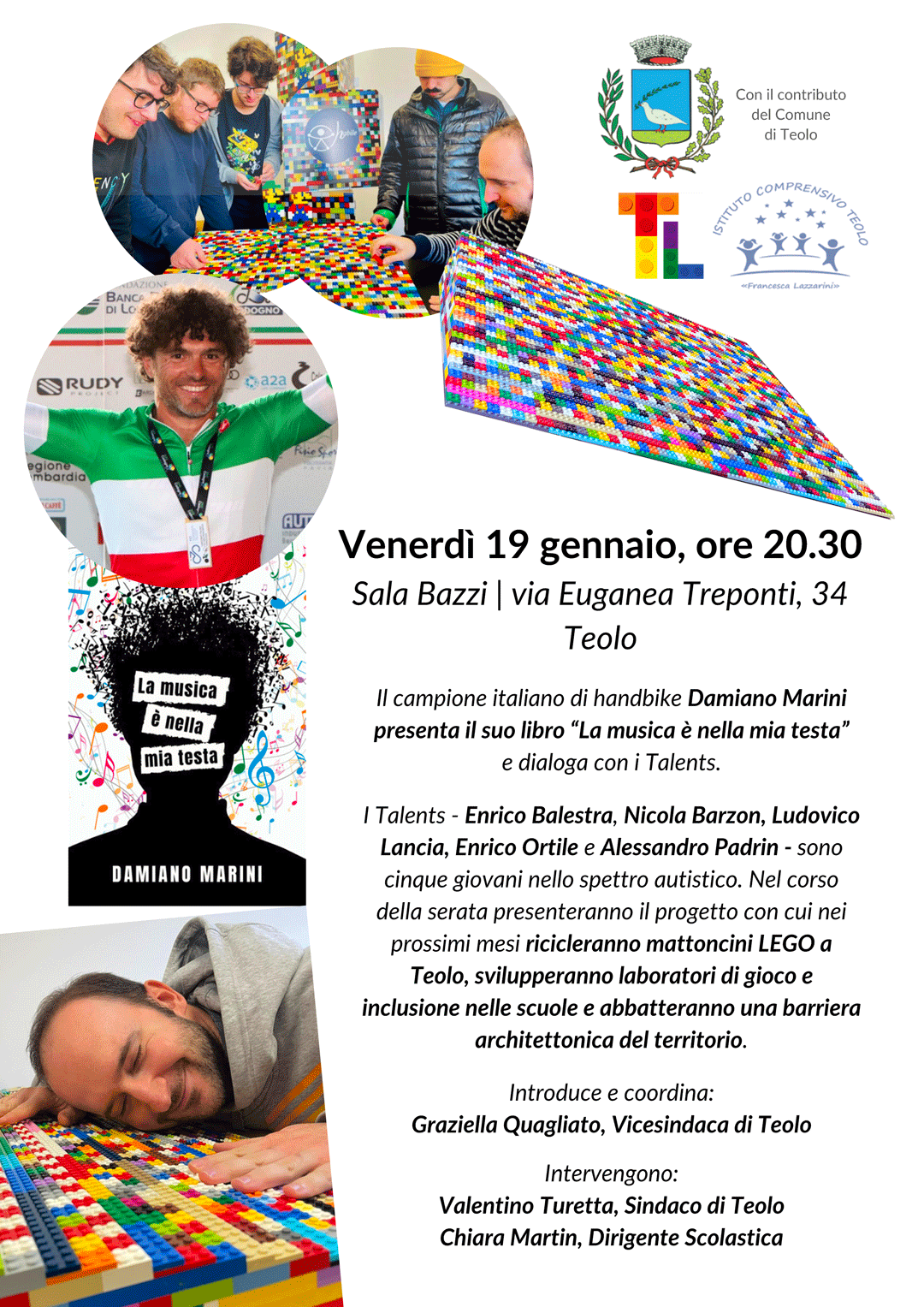 I Talents - Enrico Balestra, Nicola Barzon, Ludovico Lancia, Enrico Ortile e Alessandro Padrin - sono cinque giovani nello spettro autistico. Nel corso della serata presenteranno il progetto con cui nei prossimi mesi ricicleranno mattoncini LEGO a Teolo, svilupperanno laboratori di gioco e inclusione nelle scuole e abbatteranno una barriera architettonica del territorio.