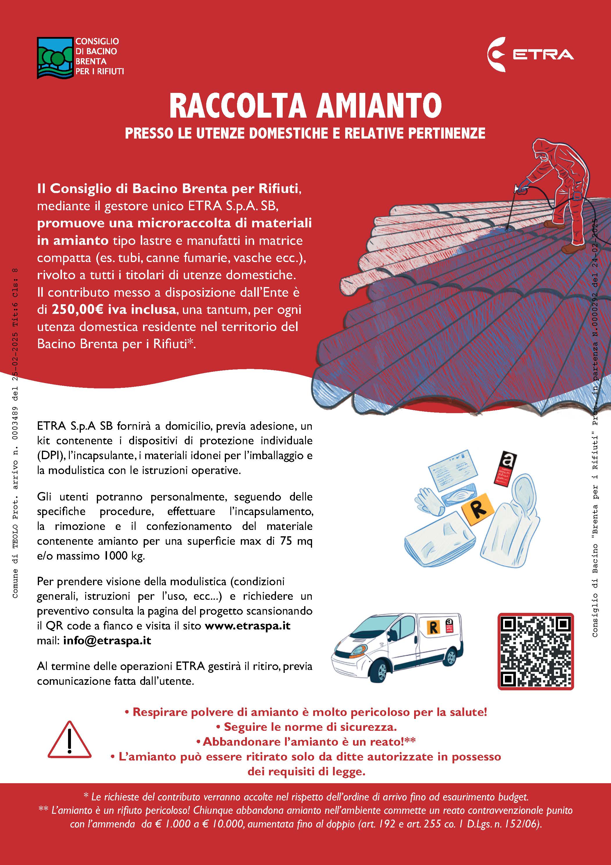 Il Consiglio di Bacino Brenta per Rifiuti, mediante il gestore unico ETRA S.p.A. SB, promuove una microraccolta di materiali in amianto tipo lastre e manufatti in matrice compatta (es. tubi, canne fumarie, vasche ecc.), rivolto a tutti i titolari di utenze domestiche.