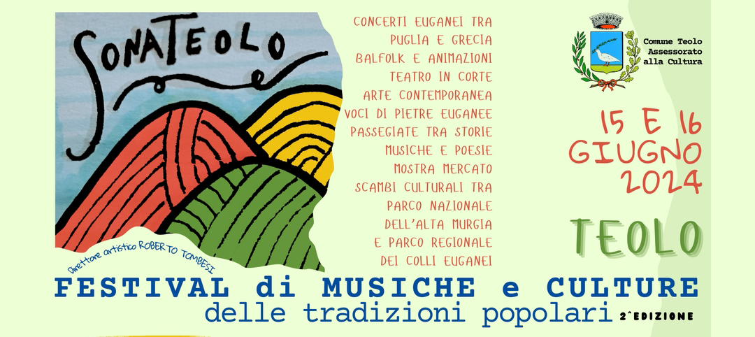 Quest’anno SONATEOLO diviene un ricco contenitore culturale delle tradizioni popolari dentro al quale si vivranno insieme: CONCERTI EUGANEI TRA PUGLIA E GRECIA - BALFOLK E ANIMAZIONI - TEATRO IN CORTE - ARTE CONTEMPORANEA - VOCI DI PIETRE EUGANEE - PASSEGIATE TRA STORIE MUSICHE E POESIE - MOSTRA MERCATO - SCAMBI CULTURALI TRA PARCO NAZIONALE DELL’ALTA MURGIA E PARCO REGIONALE DEI COLLI EUGANEI.
