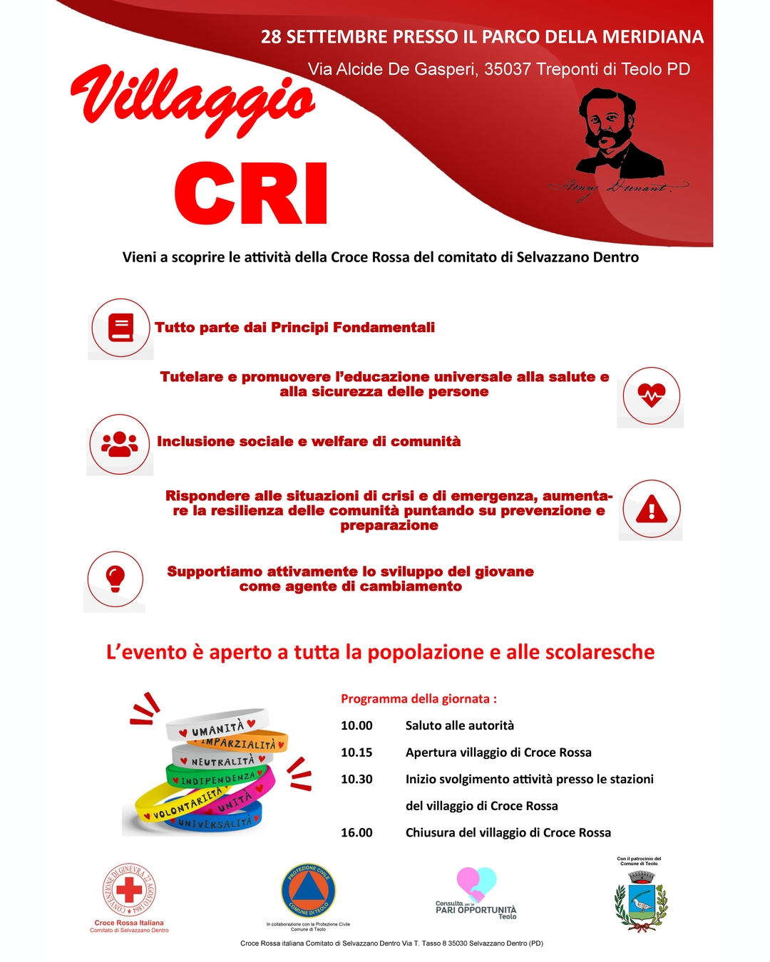 Il Villaggio della Croce Rossa organizzato da questo Comitato C.R.I. in collaborazione con i Colleghi della Protezione Civile e con il Patrocinio del Comune di Teolo si terrà il giorno 28 settembre 2024 presso il Parco della Meridiana in località Bresseo (via Alcide De Gasperi - 35037 Treponti di Teolo) dalle ore 10.00 alle ore 16.00 come da programma: