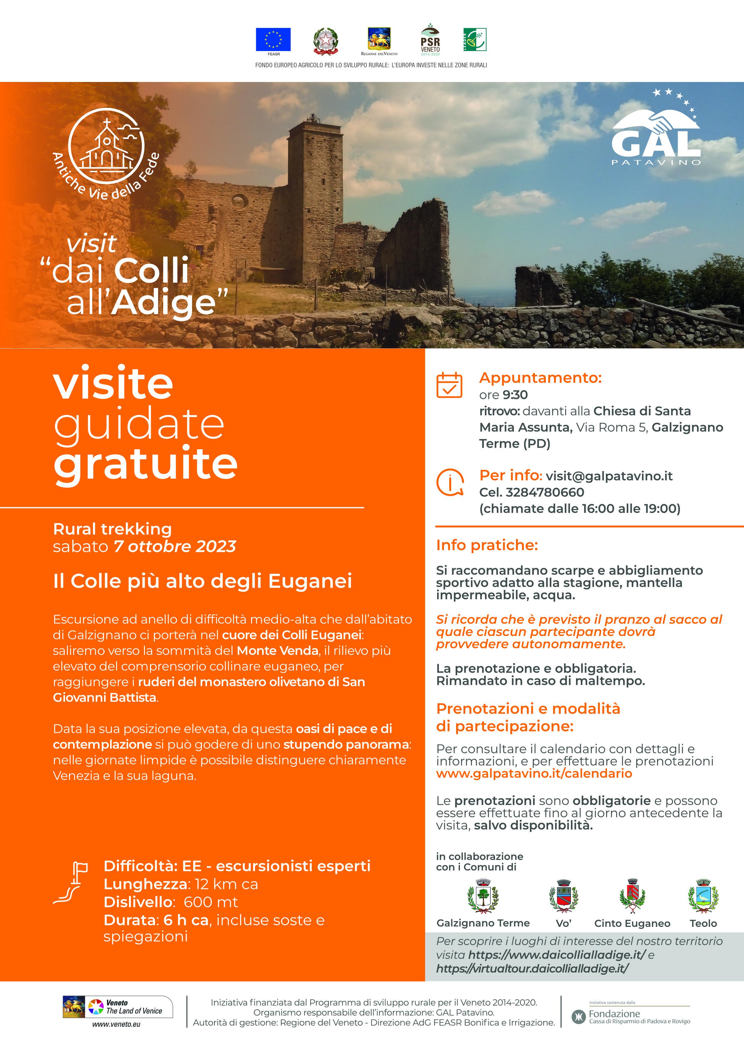 Antiche vie della fede”, format “Rural trekking”, con partenza alle ore 9:30 ritrovo: davanti alla Chiesa di Santa Maria Assunta, Via Roma 5, Galzignano Terme (PD).